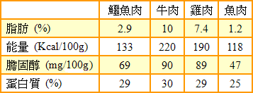 圖表一 : 鱷魚肉及其他肉類的營養成份比較
